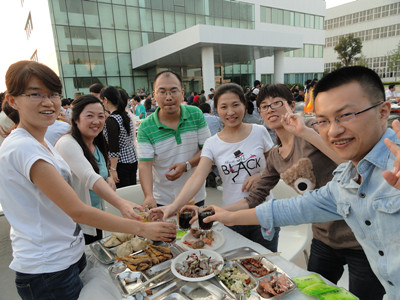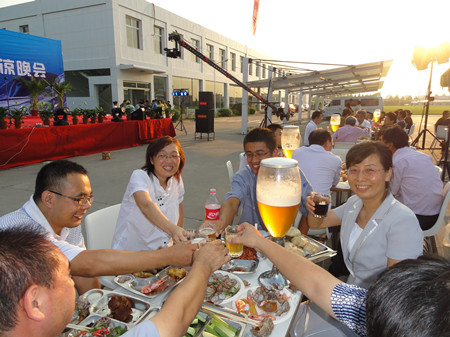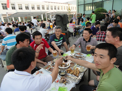 17:30分, “第四屆員工納涼晚會”正式開始。首先是員工聚餐。近400名員工,伴著歡快的樂曲聲,推杯換盞,大快朵頤。公司總經(jīng)理志賀進、常務(wù)副總經(jīng)理王正軍等公司領(lǐng)導(dǎo)走入員工中,與員工們親切交談,敬酒祝愿,整個會場洋溢著一張張歡樂的笑臉。